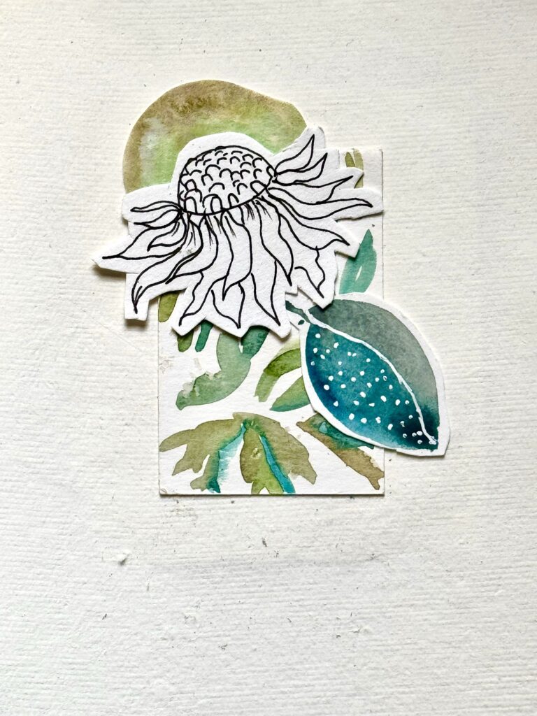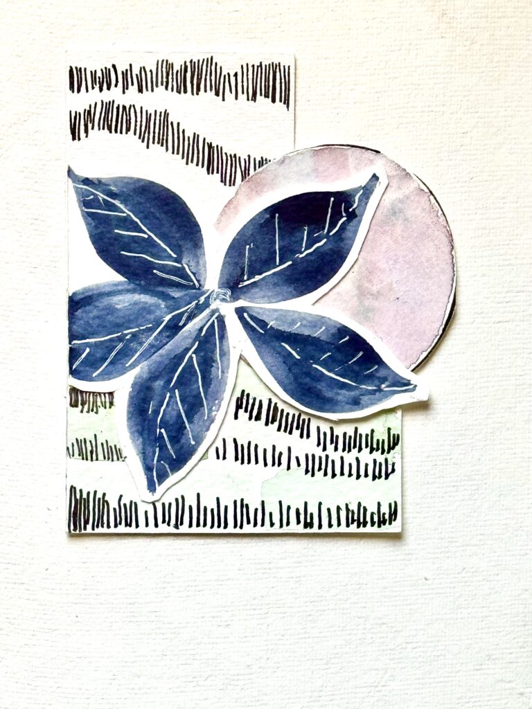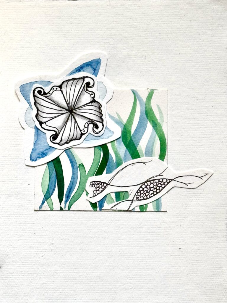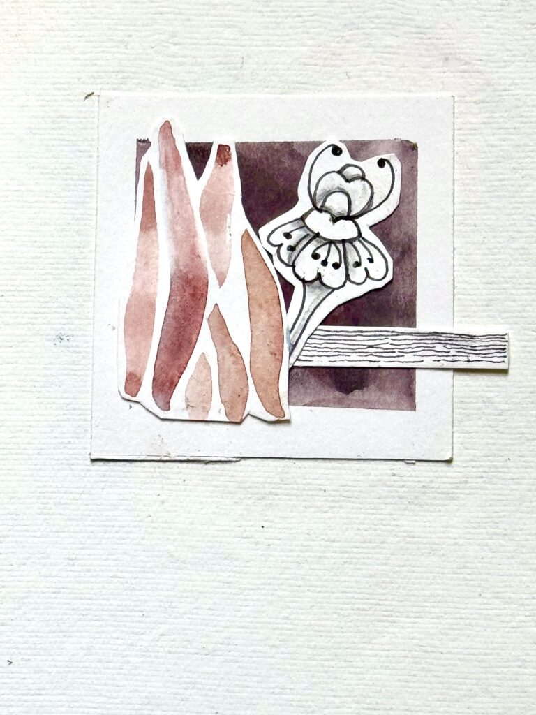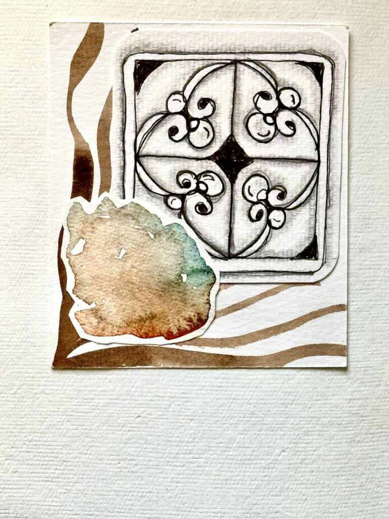 Several messages came to me while creating during these last seven days.  They are that: 1) it is not wise to make hard and fast judgements and 2) much beauty comes from embracing imperfection.  I keep reminding myself that the bits and pieces that I am using in each of these meditations are coming from essentially my scrap pile.  At some point, I had deemed them as a discard or not good enough.  This is true particularly of the pen sketches.  Most of them are a first attempt at something that I eventually drew “better.”  And most of the painted pieces are swatches, practice pieces, or paper where I was cleaning off a brush.  Yet, each of these discards comes together  purely through synchronicity creating something beautiful and whole.