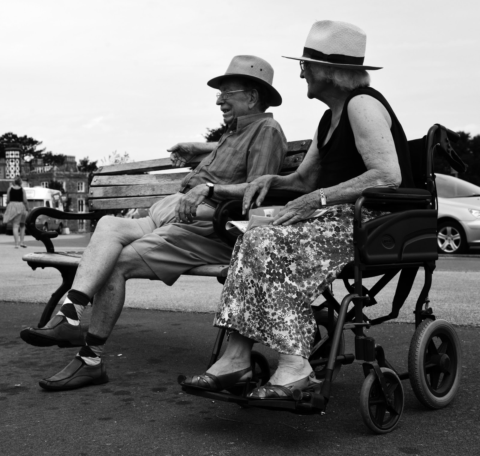 One of the iconic figures in Bristol is the Clifton suspension bridge. We first drove up and viewed it from afar. It was from a scenic overlook that I took the above picture of this older couple. I watched as the gentleman pushed his wife in her wheelchair over to a spot that had just the view she wanted. They then sat together and enjoyed their time together. I like the black and white image because it sets them apart from the somewhat cluttered background, but there is something about the color photo that I like too.