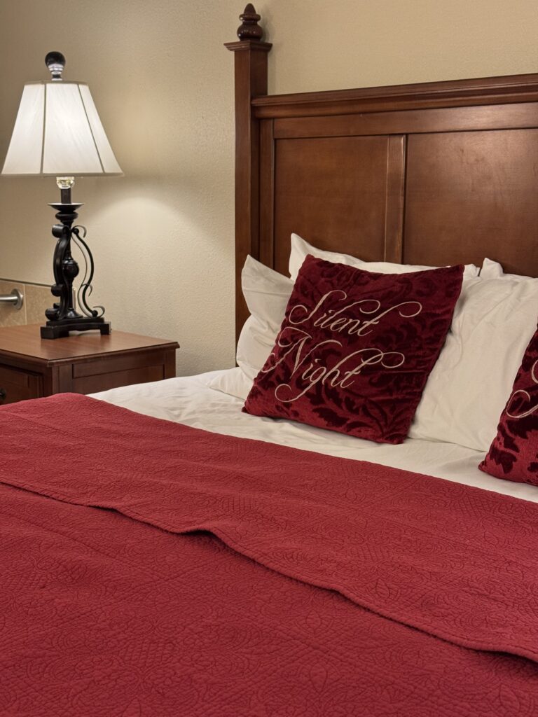 The rooms are all decked out with holiday cheer as well. A Christmas tree, garland draped fireplace, wreaths, and holiday bedding are standard in every room. Such a peaceful feeling!
