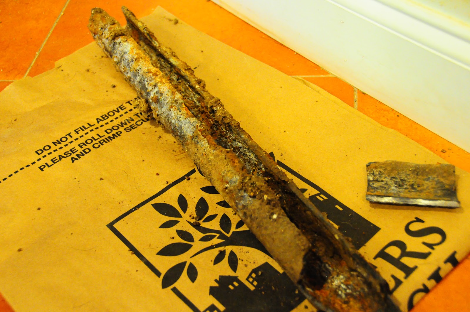 Fifty years ago this was a brand new cast iron pipe that served as the drainpipe for the kitchen sink. As you can see, it is no longer a pipe; it has about an inch wide section missing. This is the result of corrosion caused by all the crud that goes down a kitchen sink over the span of fifty years. It is kind of scary to think that the stuff that goes down the kitchen sink is the remnants of stuff that was on our plates and thus went down our “pipes.” Does it do the same thing to our insides?